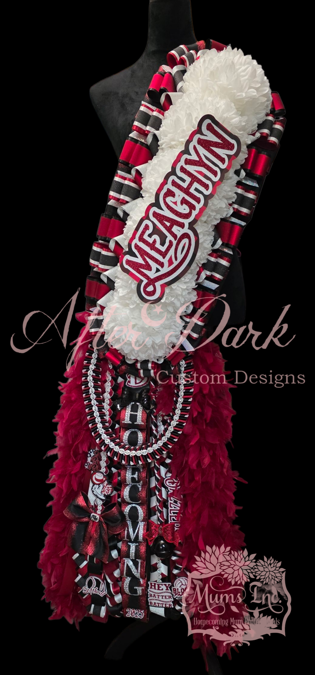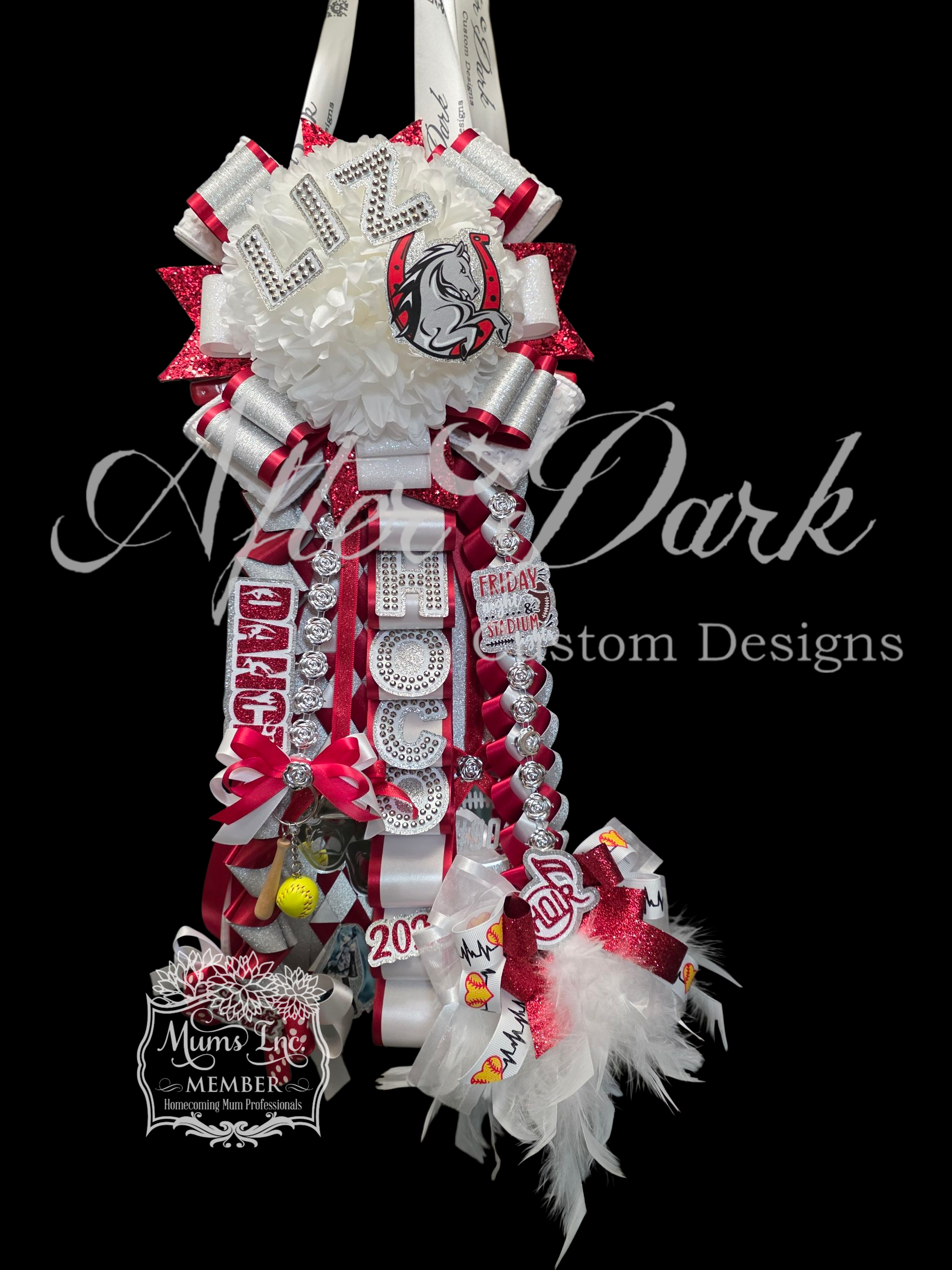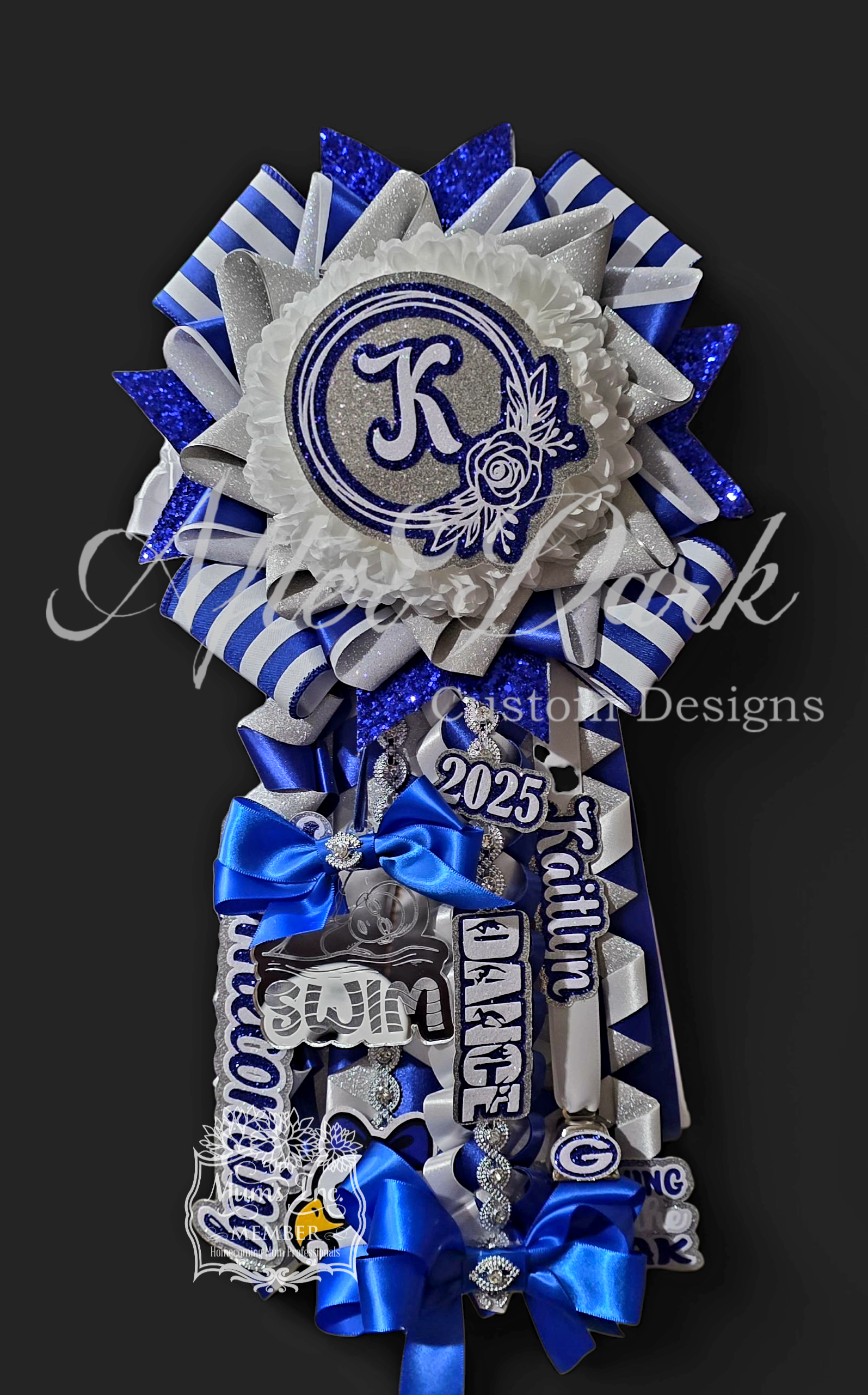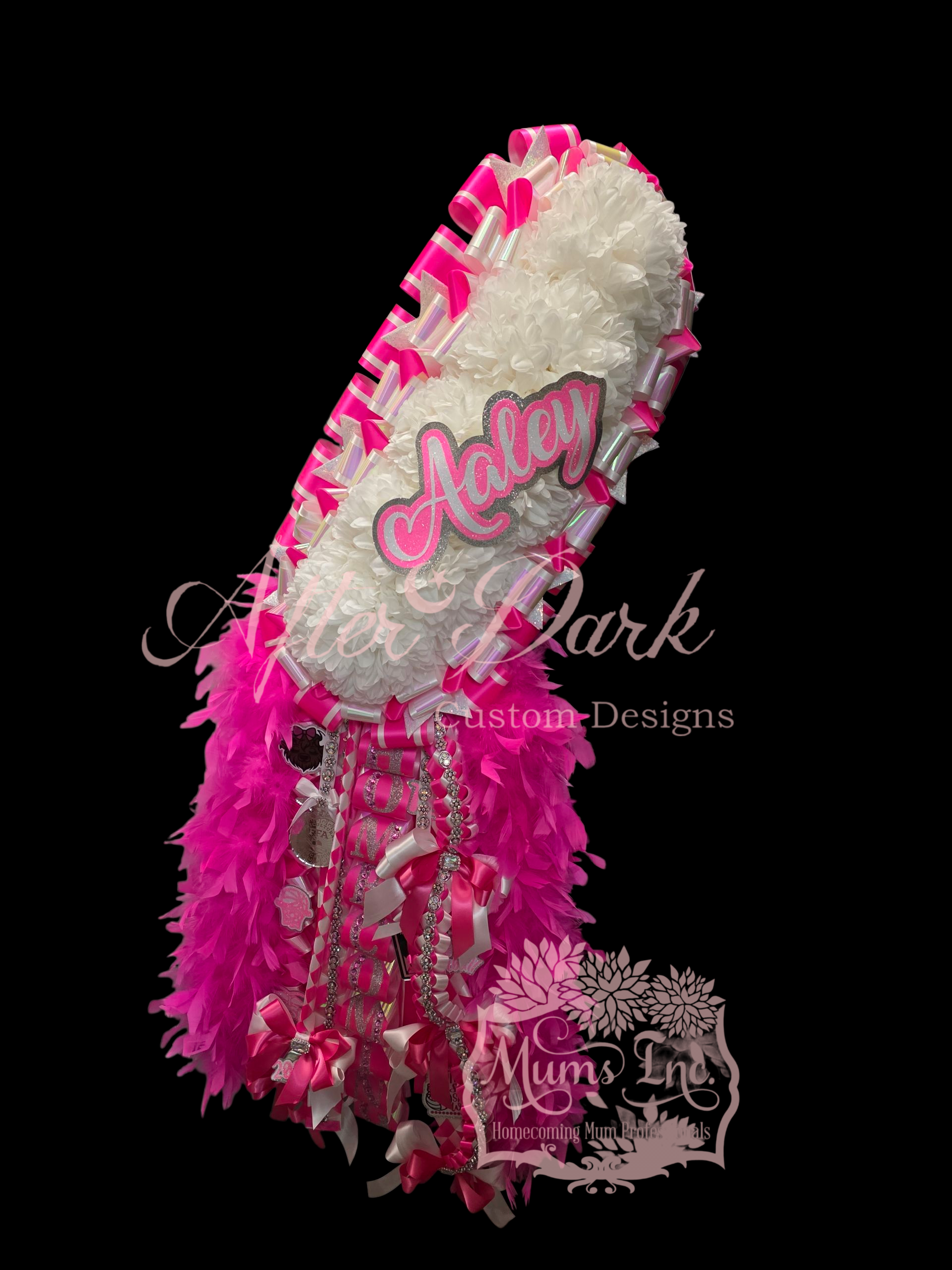 *Luxury Custom Centerpiece—A showstopping focal point: monogram elegance, a sparkling megaphone, or a plush character dressed in full couture — nestled in the floral heart of your mum.